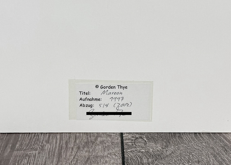 Dieser klassische Baryt-Abzug stammt aus meiner analogen Werkreihe und wurde 2002 von mir persönlich vom Originalnegativ gefertigt. Die Aufnahme selbst entstand im Jahr 1997. Es handelt sich um die Nummer 5 von insgesamt 8 hergestellten Abzügen dieser Edition.